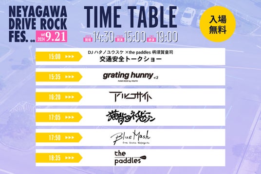 地元寝屋川市出身のバンド「the paddles」をはじめ、ライブハウスシーンで活躍する多数のアーティストが出演。イベントMCにはFM802のDJ ハタノユウスケさんを迎え、the paddlesの柄須賀皇司さんとの交通安全トークショーも実施します。