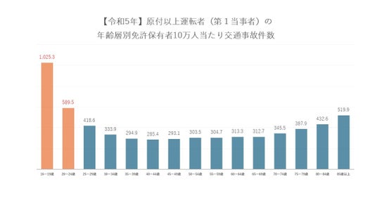 原付以上運転者(第1当事者)の年齢層別免許保有者10万人当たりの交通事故件数は、16~19歳が1025.3件と最多で、次いで20~24歳の589.5件です。