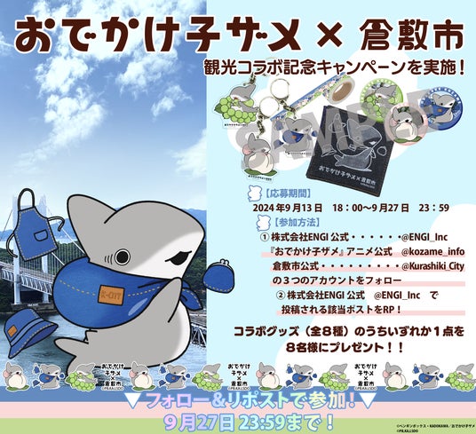 株式会社ENGI(本社:東京都中野区 代表取締役社長:吉岡宏起)は、ENGIの制作する人気アニメーション「おでかけ子ザメ(原作:ペンギンボックス)」と倉敷市とのコラボを、2024年9月17日からスタートすることを発表いたします。