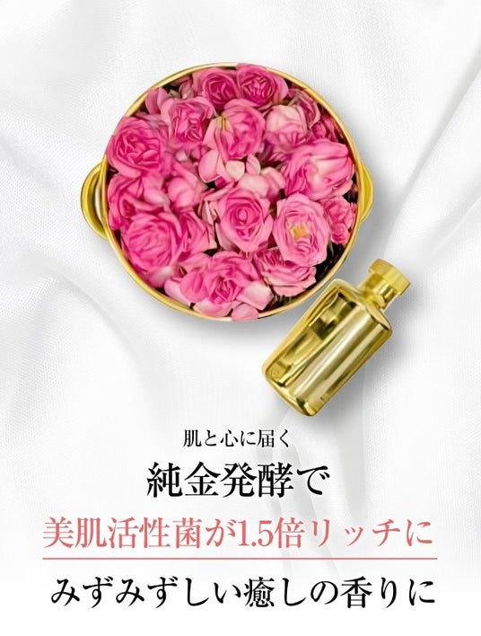 純金タンクで発酵した、みずみずしいバラ発酵菌オイルの香りがリラックスタイムを促進し、ストレスフルな毎日を幸福感で彩ります。