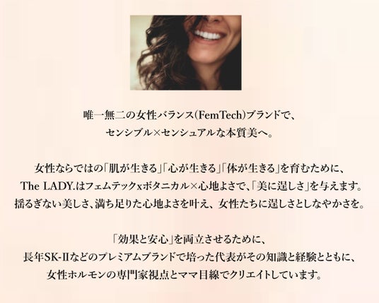 The LADY.はホルモン変化世代の大人の女性へ、効果と信頼・安心を届けるため、「ホルモンバランス」x「植物と菌のチカラ」x「心地よさ」にこだわり、女性ホルモンの専門家視点とママ目線でクリエイトしています。