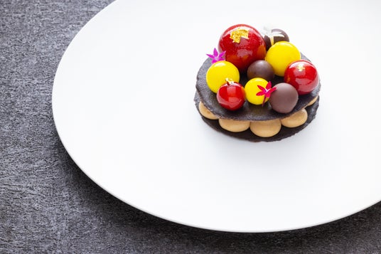 栗と洋梨を使った秋の深まりを感じられる一皿です。赤や黄色の艶めく球体が印象的なデザインで、コースの最後まで料理への期待をそそります。球体の一つひとつに、洋梨のムースやコンポート、果実が閉じ込められています。重ねたショコラのパートフィロー(*)の間には、マロンクリームとハチミツのアイスクリームを忍ばせました。ゆっくりと時間をかけて楽しめる、コースの締めくくりにふさわしいデザートです。