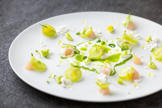 ユカワタンでは、信州・軽井沢らしいメニューでおもてなしをしたいという思いから、この地域で古くから食されている鯉を年間通して提供しています。「鯉のコントラスト」では、締めて間もないさっぱりした味わいの鯉と、熟成させて深みを増した鯉、異なる仕立てを楽しめます。この秋は鯉にシャインマスカットを合わせました。旬のシャインマスカットが、その甘さと青い香りで鯉の旨みを引き立て、また鯉の塩味がシャインマスカットの甘さを際立たせています。ハーブが香る鯉のコンソメとエルダーフラワークリームのソースで華やかに味わう前菜です。