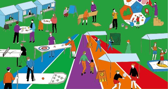 開・閉会式会場に登場するウェルスポエリア。ウェルスポとは、スポーツ体験(well sports)+おもてなし(welcome spot)の意味が込められています。さまざまなスポーツに触れ、いろいろなグルメに舌鼓を打つ。大人も子どももゲーム感覚で体を動かして楽みましょう。