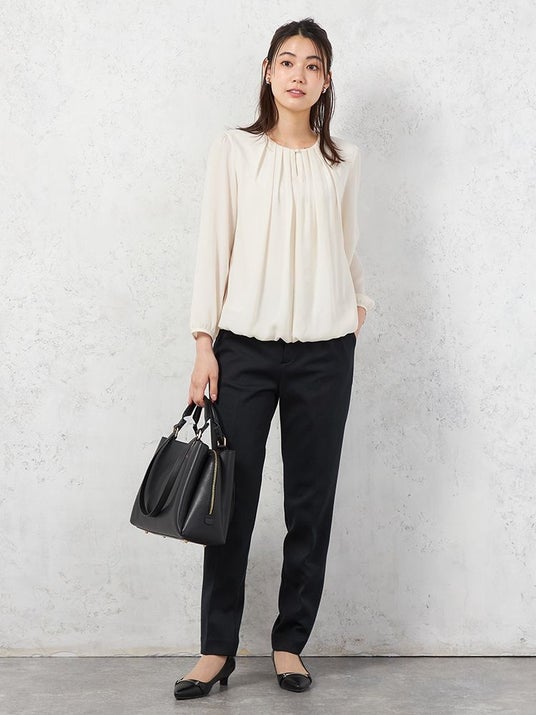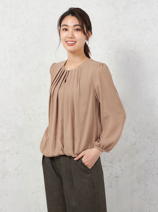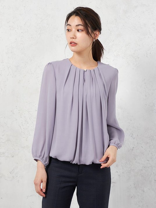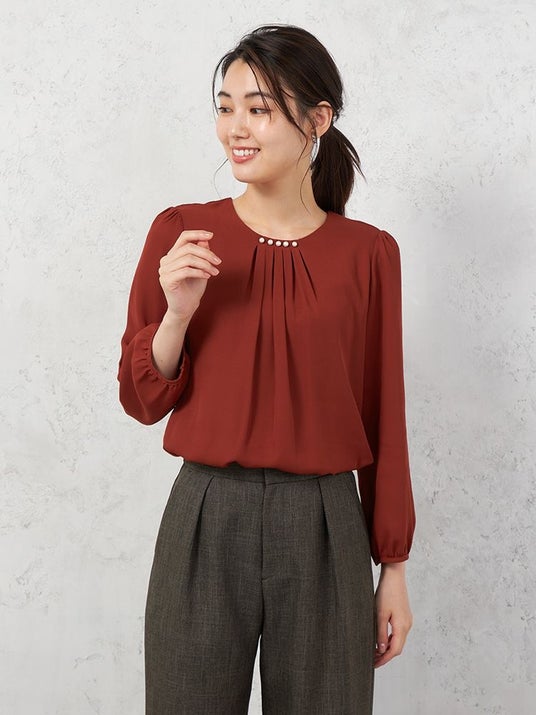 裾バルーン仕様でボトムイン・アウトどちらも裾周りがもたつかない『裾バルーンパール釦ブラウス』と、フロントパール付きで顔周りが華やかな印象の『パールディテールブラウス』の2デザインをご用意しました。