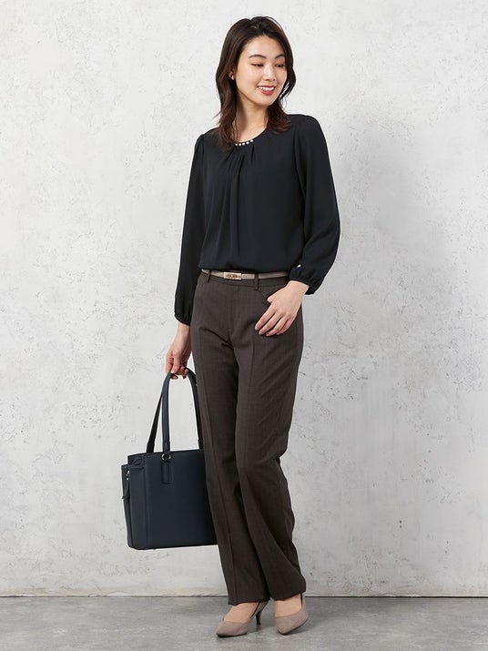このたび発売したはるやまレディスのAW新作ブラウスは、インナーが透けにくい身頃2枚仕立て仕様、ジャケットからブラウスの袖が見えにくい9分丈袖、華美になりすぎないワンポイントを衿元にあしらったオフィスウェアにおすすめなきちんと感を演出してくれるアイテムです。