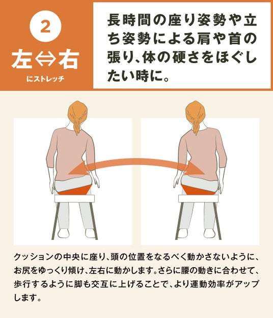 空気で膨らませる一般的なバランスボールに比べて省スペースで、ダイニングチェアやオフィスチェアなど椅子を選ばずどんな座面にも置いて使用できます。座って骨盤を動かすことで、仕事中やTVを見ながらでも簡単にストレッチができ、「ながら運動」の習慣作りも期待できます。