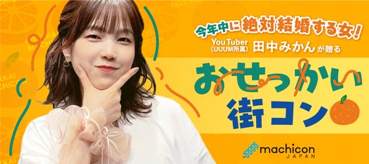 今年中に絶対結婚する女!を目標に掲げている、UUUM所属の動画クリエイター・田中みかんさんと、究極の「おせっかい街コン」を開催いたします!これまで数多くの街コン・婚活イベントに参加してきた、田中みかんさんだからこそプロデュースできる、「楽しめる・出会える街コン」を企画いたしました。当コラボイベントでは、田中みかんさんの独断と偏見による「お似合いマッチング」企画や、お悩み相談ができる「スナックみかんタイム」など、田中みかんさんファンもそうでない方も楽しめる企画が盛りだくさんです。また、イベント開催後に当日の様子を収めた動画も公開予定ですので、ぜひご参加・ご視聴ください!