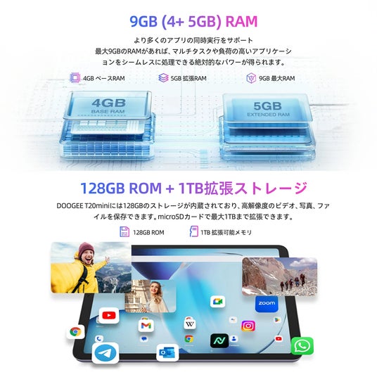 高性能タブレット – スペックと機能このタブレットは、9GBのRAMと128GBのROMを搭載し、1TBまでのTFカードに対応しています。これにより、アプリのマルチタスク処理や大容量のデータ保存も快適に行えます。さらに、TUV認証を受けた目に優しいディスプレイを備えており、長時間の使用でも目の負担を軽減します。