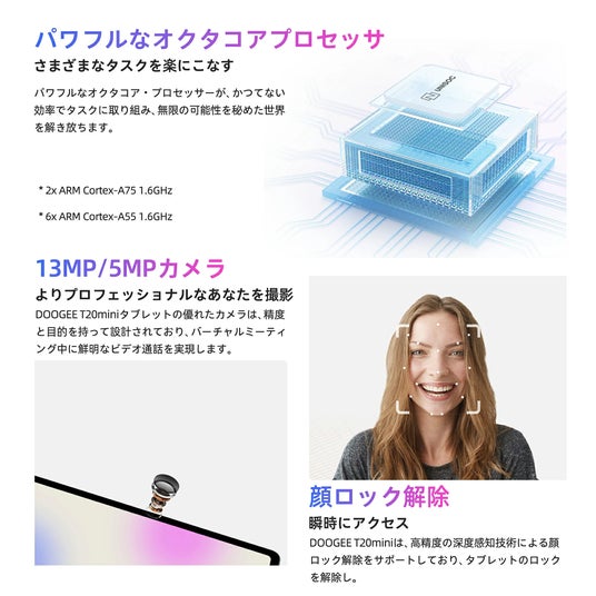高性能タブレットの魅力DOOGEE T20 Miniは、13MPリアカメラやGPS+Beidou+GLONASS+Galileo+AGPSナビゲーションを搭載しており、旅行や日常の様々なシーンで活躍します。顔認識機能を備えたセキュリティも強化されており、プライバシーを守りながら安心して利用できます。