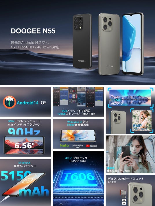 特長:Android 14 スマトーフォン SIMフリー 9GB RAM&128GB ROM+1TB拡張 90Hz リフレッシュレート DOOGEE N55 6.56インチスマホ 5150mAhバッテリー 4G LTE モバイル端末 5G WIFI WIFIモデル 携帯電話 顔認識 Widevine L1 13MP AIカメラ スマホ 通信