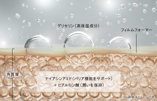 有用成分、ナイアシンアミド*² 、ヒアルロン酸、グリセリンからなるトリプル ハイドロロック コンプレックスを約10%配合。角質層を潤い満たし、洗顔後も潤い、ハリ、ツヤのあるなめらかな肌に。