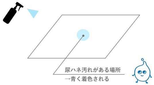 尿ハネ汚れがある場合、消色剤が尿ハネ汚れに作用するため、尿ハネ汚れ部のみ着色剤が残り青くなります。