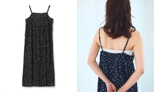 着用のキャミワンピースはコレ!シワになりにくいので長時間座っているような女子会にはまさにぴったりなキャミワンピ。体のラインを拾わないフレアシルエットなので追加でスウィーツを食べ過ぎても安心。フラワードットプリントは難しそうに見えて、じつは幅広い年代の女性に似合う合わせやすい柄。ストラップで長さが調整できるので、スニーカーからパンプスまで合わせやすいのもgood!
