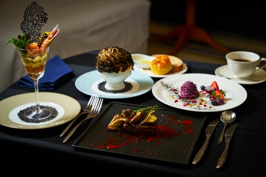 月夜をテーマに、黒を基調とした12種類のスイーツがディナービュッフェに登場。漆黒の中にベリーのソースやジャムなどの赤が映え、ミステリアスな肌で感じる大人ハロウィンを演出します。