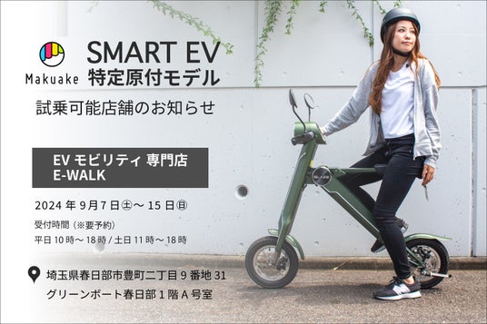 株式会社ブレイズ(愛知県名古屋市、代表取締役:市川秀幸、以下ブレイズ)は、Makuake応援購入プロジェクトにて先日発売した「16歳以上免許不要」の新商品:スマートEV 特定原付モデルが、弊社正規ディーラーの「EVモビリティ 専門店 E-WALK/有限会社ウオーク」(埼玉県春日部市、代表取締役社長:細貝透)にて、2024年9月7日(土)~15日(日)の期間、ご試乗いただけますことをお知らせいたします。