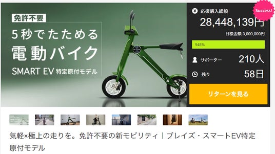 プロジェクトスタート1時間で目標金額を達成し、9月5日現在2,800万円を突破した注目の電動バイクとなっております。近郊にお住いのお客様におかれましては、せひこの機会に、「スマートEV特定原付モデル」をご体感ください!