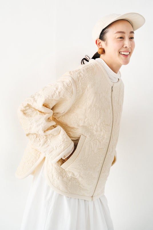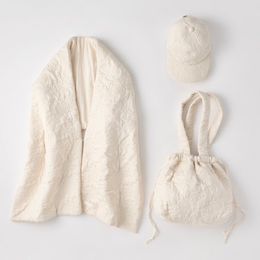 なめらかな肌触りとほのかな光沢感、花柄の陰影が上品なフラワーキルトシリーズ。生分解性とノープラスチックの観点を融合させたデザインです。中わたに「lavalan(R)」という生分解性のあるシートを使用し、滑らかさと光沢感のあるオーガニックコットンのサテン生地をかさね、花柄の刺繍を施しました。中わたの原料にはノンミュールジングウールと、トウモロコシ由来のPLA(ポリ乳酸)を組み合わせています。