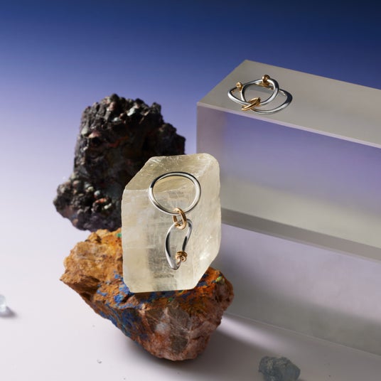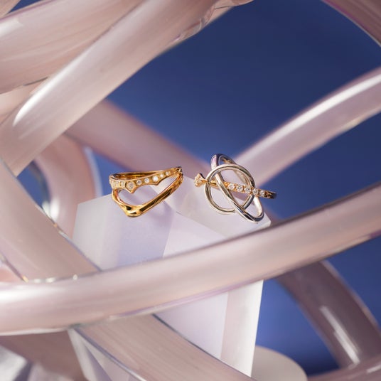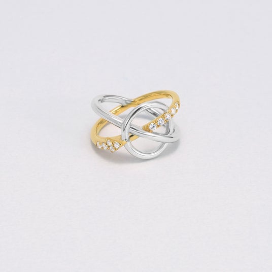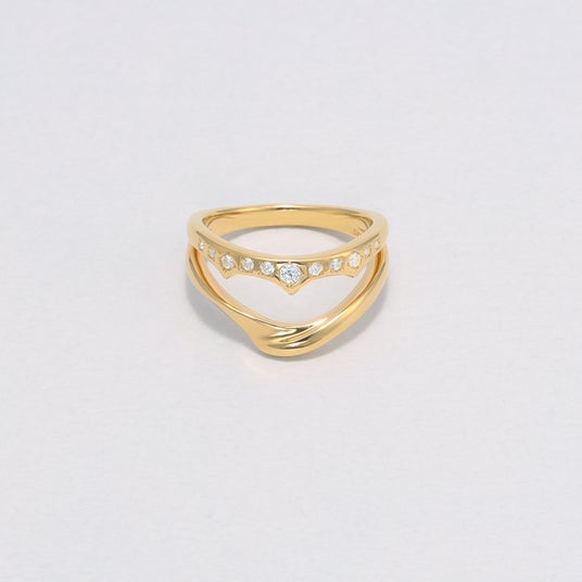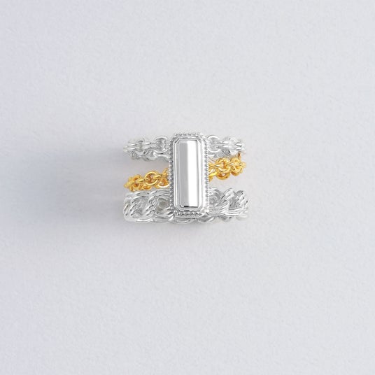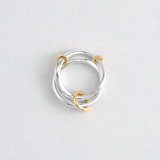 液体金属である水銀をイメージしたフォルムの2本のリングをK10YGの輪で繋いだ「知恵の輪」のようなフレキシブルなデザインが特徴。重ねて着けたり、ダブルフィンガーのように隣り合う指に着けたり、もう1本をチャームのように下げたりと何通りにも着用できます。