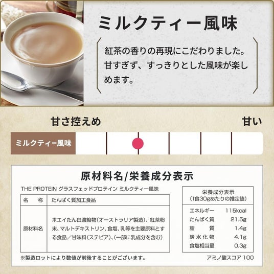 累計販売数50万個突破の THE PROTEIN(通称:ザプロ)から新フレーバー <ミルクティー風味>が販売開始!紅茶の香りを再現しており、すっきりとした甘さが特徴のフレーバーです。
