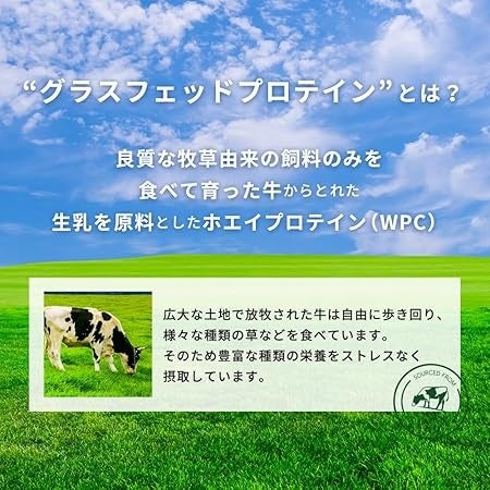 良質な牧草由来の飼料のみを食べて育った牛からとれた生乳を原料としたホエイプロテイン(WPC)のことです。広大な土地で自由に育てられ、様々な種類の牧草を食べているため、栄養価が高く、安全性も高いとされています。