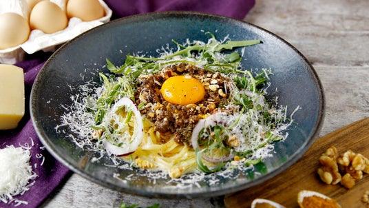 淡路島産牛肉とクミンやコリアンダーなどのスパイスを使用してカレー風味に仕上げたミートソースに、淡路島のブランド卵『北坂たまご』の卵黄を乗せて…。北坂たまごならではの濃厚な卵黄をからめれば、スパイシーさとまろやかさの黄金バランスが誕生!パセリやルッコラなどハーブの香りがアクセントの癖になる一品です。