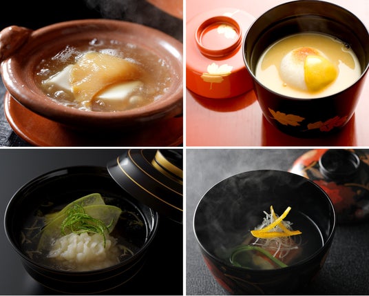 各料理人の料理イメージ 左上から時計回り 高橋 拓児 氏/木乃婦(三代目主人)、中村 元計 氏 /一子相伝なかむら (六代目主人)、山本 祐輔/五島リトリート ray by 温故知新、才木 充 氏/直心房さいき (主人)