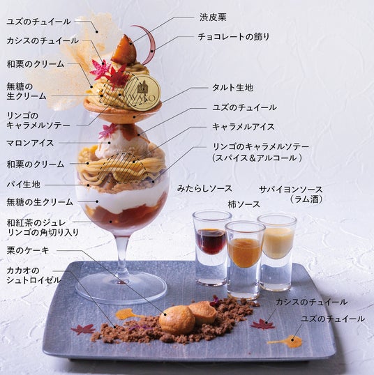 パフェとケーキをさらに楽しむために考案されたのは、柿、サバイヨン(洋酒)、みたらしの3種の特製ソース。プレートを彩るイチョウは柚子、カエデはカシスのチュイールです。