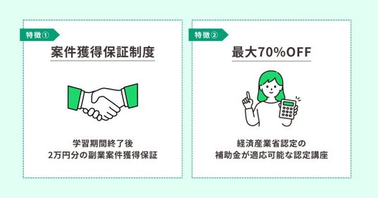 経済産業省の「リスキリングを通じたキャリアアップ支援事業」認定講座のため、コース終了後に所定の条件を満たした方は最大70%のキャッシュバックを利用できます。