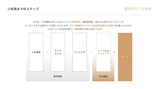 2022年10月サービスリリース。ゴージャスは、理想のお相手と出会いたいと考える男女をターゲットとした、「あなたにふさわしい、ハイクラスな出会い」を実現する完全審査制の恋活・婚活マッチングアプリです。 ゴージャスは、AIを用いた独自の審査を通過した会員のみが利用可能です。ハイクラスな出会いをご提供するため、あなたにふさわしいお相手を毎日ピックアップ。