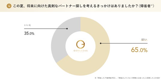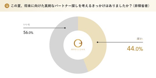 ・「帰省した/今後帰省予定」と「帰省はしていないが家族とは会った」と回答した人の65%が、「将来に向けた真剣なパートナー探しを考えた」と回答。一方で、帰省もせず家族と会う予定もない人は、将来に向けた真剣なパートナー探しを考えた人が「はい」(44%)「いいえ」(56%)と逆転、帰省等で家族と会った人の方が、より真剣なパートナー探しを考えたという結果に