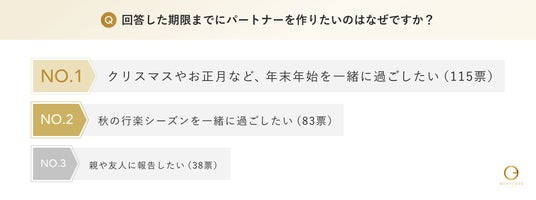 ・「パートナーをいつまでに作りたいか」については、「すぐにでも」(52.4%)「年末までには」(25.8%)と回答、その理由のトップは「クリスマスやお正月など、年末年始を一緒に過ごしたい」(115票)と、夏の終わりとともに、年末に向けたパートナー探しへの意欲の高まりが見える結果に
