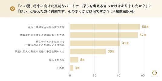 ・この夏に将来の真剣なパートナー探しを考えた理由は「友人・身近な人に恋人ができた」(58票)、「休暇で将来を考える時間があったため」(57票)がほぼ同率