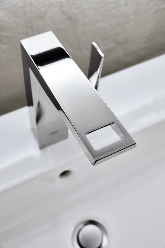 正方形のプレートと円柱形の組み合わせ。細部はあくまでも幾何学的に、そして柔らかくカーブした吐水口。その長方形の口先からほとばしる自然な水流は、新鮮な驚きとともに水の魅力を再認識させてくれます。
