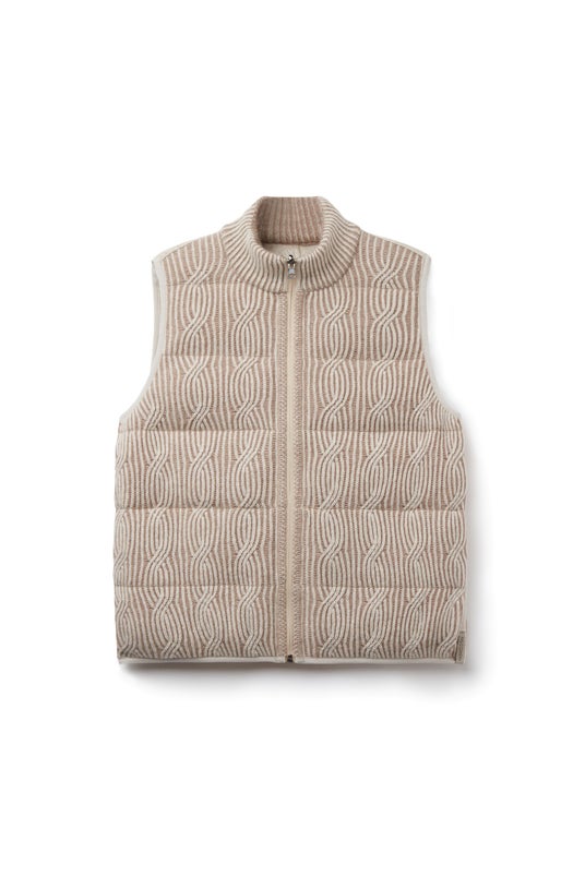 表側は2色の「ウルトラソフト」カシミヤのケーブル編・リブ編地、内側はテクニカルファブリック製