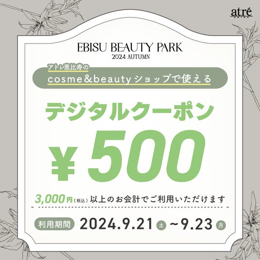ショップイベントでサービスやタッチアップを受けていただいた方限定で、アトレ恵比寿のコスメビューティーショップで3,000円以上のお買物で使える500円デジタルクーポンをプレゼントします。