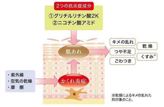 肌の透明感が低下する原因は、大きく2つあります。ひとつは角質層のうるおい不足、もうひとつは“かくれ炎症”です。身体を外側から守る皮膚は、紫外線や乾燥、摩擦など外部からの刺激を繰り返し受けることで、気づかないうちに微弱な炎症を起こしています。この“かくれ炎症”は、放置していると肌あれによる肌のくすみ*3や乾燥、透明感不足などの原因に繋がります。