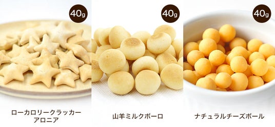 まん丸お月さまを小さくしたかのような「ナチュラルチーズボール」、空に輝く星をかたどった「ローカロリークラッカー アロニア」、お供えする丸いお月見団子の代わりに「山羊ミルクボーロ」をセレクトしました。トレーニングやダイエット時のおやつにも便利です。通常価格2,090円から21%OFFの1,650円(税込)での特別販売です。