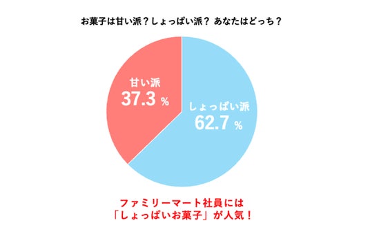 このたび、ファミリーマート社員311人に「お菓子は甘い派?しょっぱい派?」というアンケートを実施いたしました。結果は甘い派が37.3%、しょっぱい派が62.7%と、しょっぱい派が大きくリードする結果となりました。