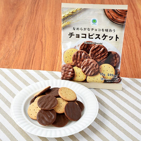 【内容】サクッと軽い食感に焼き上げたビスケットにチョコレートをハーフコーティングしたチョコビスケットです。