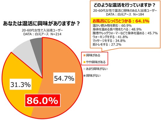 身体の不調を緩和するメソッドとして認識されている温活ですが、今回当社が独自に調査したところ、入浴液ユーザーの多くが温活に興味があることが分かりました。また、温活に興味のある方の6割以上が実際にお風呂にじっくりとつかることを実践していることも分かりました(共に下図参照)。