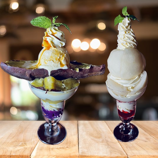 左:まるごと焼き芋パフェ 右:まるごと梨パフェ