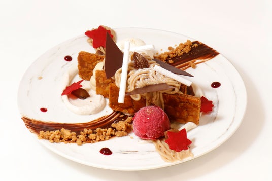 中に閉じ込めた渋皮栗の食感や、お皿に盛り付けたもみじを練りこんだ生クリームのほろ苦さが秋を深く感じさせてくれる一皿です。