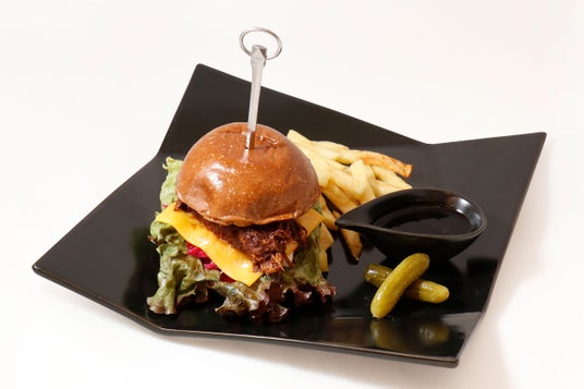 カカオを練りこんだオリジナルバンズで、和牛100%のジューシーなパテを挟んだビーフハンバーガー。