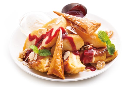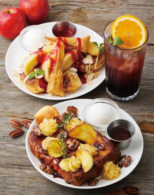 シナモンアップルパイゴロッとした自家製焼きリンゴ&サクサク食感のパイが自慢のフレンチトーストと好相性!ほどよいシナモンの香りが秋らしさを引き立てます。別添のラズベリーソースで味の変化も楽しんで。