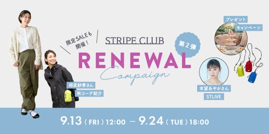株式会社ストライプインターナショナル(本社:岡山県岡山市、代表取締役社長:川部将士)が運営する自社ECサイト「STRIPE CLUB (ストライプクラブ)」は9月13日(金)より、リニューアルキャンペーン第2弾を実施いたします。