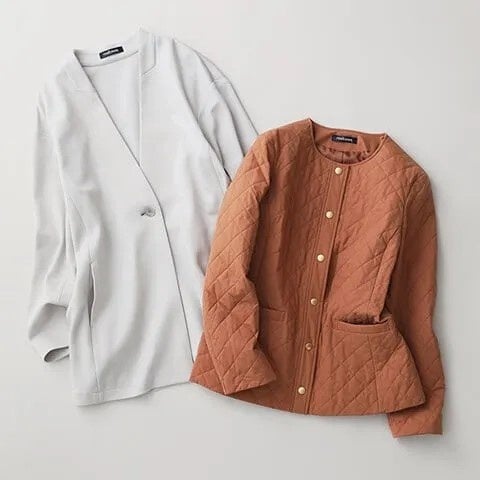 (左)暖冬傾向の日本の冬にちょうど良い、真冬手前まで重宝するコーディガン。ポンチ素材ならではの楽な着用感がとにかく嬉しい。(右)軽く羽織れてオンオフ兼用できる、キルティングジャケット。カジュアル感を抑えた細かいディテールがポイント。