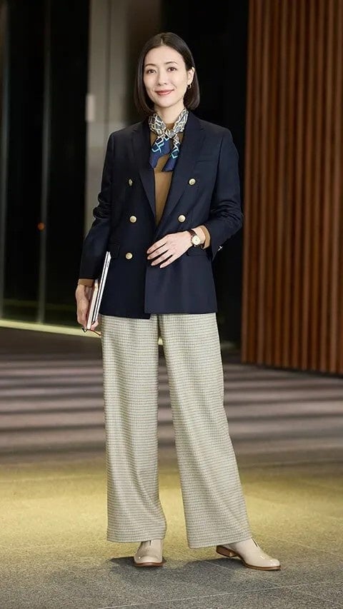 女性らしい旬のブレザーコーデを楽しみたいなら、ダブルブレストが断然おすすめ。シングルよりもゆとりのあるシルエットと長めの着丈は、さりげない体型カバーも叶えます。インナーにはこっくりカラーのハイネックニットで上品に潔く、ワイドシルエットのパンツ合わせで、今っぽいニュアンスをプラスしました。首に巻いたスカーフはブレザーとの相性も良く、顔周りも若々しい印象に!