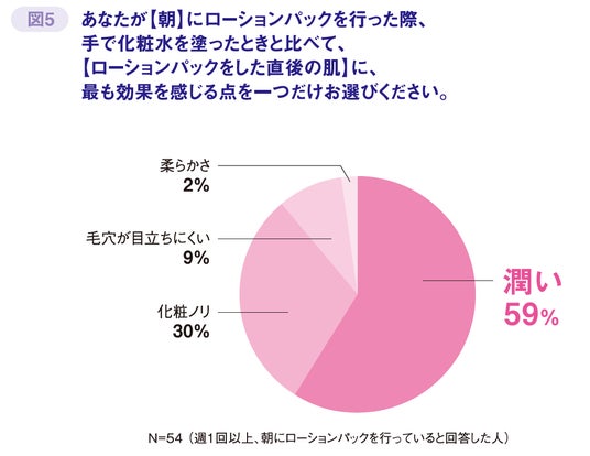 朝のルーティンとして、ローションパックを行うのはなぜなのか、その効果について聞いてみました。手で化粧水を塗布するよりも、ローションパックを行った直後の肌で実感する効果は、1位「潤い(89%)」、2位「化粧ノリ(76%)」、3位「透明感(46%)」。他にも「柔らかさ」や「毛穴が目立ちにくい」、「滑らかさ(肌の凹凸がない)」などの点でも様々な効果を実感していることが明らかに。【図4】その中で、最も効果を感じるのは、「潤い(59%)」であることも分かりました。【図5】