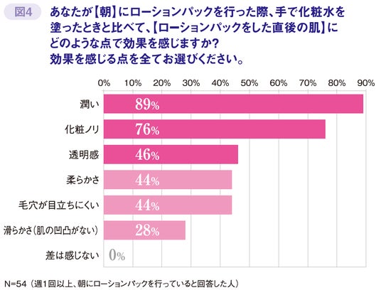 朝にローションパックをすると、手で塗布するよりも、肌の潤いや、化粧ノリが良くなるなどの即時的な効果に加えて、日中から夕方になっても潤いや化粧モチなど持続的な効果を実感している人も多いことが明らかに。